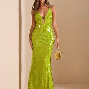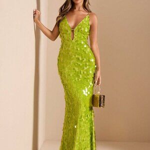Green Party Women's Deep V-Neck Hollow Lace-Up Slim Fit Luxury Sequin Dress