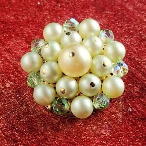 Introducing the Green Pastel Beaded Brooch, a classic vintage accessory that brings an air of elegance to your ensemble. This charming brooch features a delightful combination of pastel green beads, cream white, and mint green pearls, creating a simple yet cute design. With a brass-gold color backing, this brooch exudes old-fashioned charm while remaining timeless and versatile.