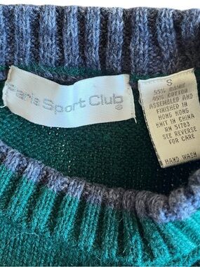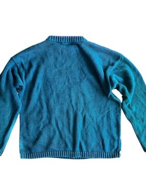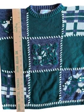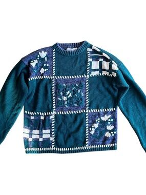 Cozy teal knit sweater with patchwork panels. Features floral and plaid textured blocks with white embroidered trim. Crew neckline and long sleeves. Soft, statement knit perfect for layering.