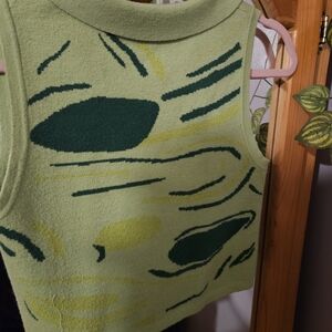 Stylish green knit vest with abstract patterns. Features a button-up front and collar.