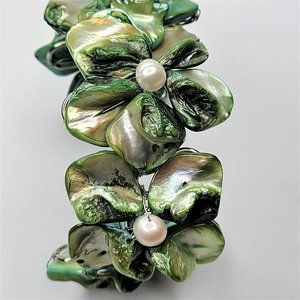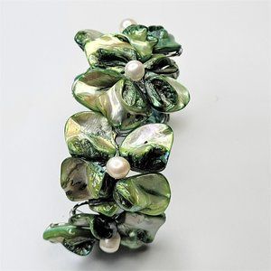 Pearls with Shell Petals Floral Adjustable Cuff Bracelet or Bangle