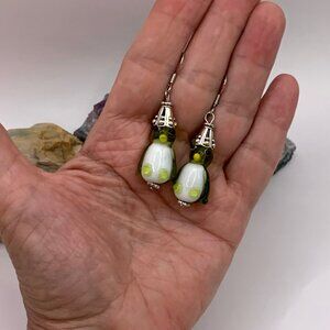 Adorable lime green penguin wearing a dunce cap ๐ This little cutie is a lampwork glass bead with a metal bead at top and bottom. Ear wires are nickel free. The earrings are about 1-1/2" long or measuring from the ear wire down, just over 2".