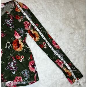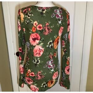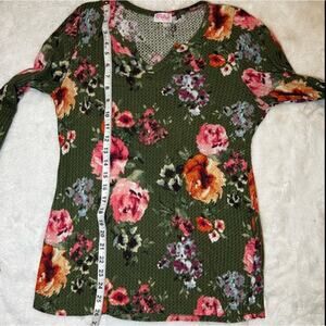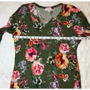 Green Pink Floral Print Waffle Knit Long Sleeve V-Neck Top