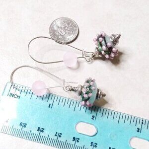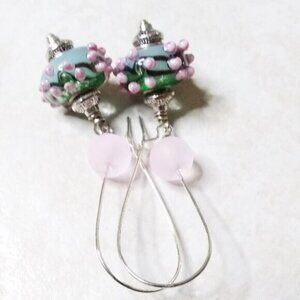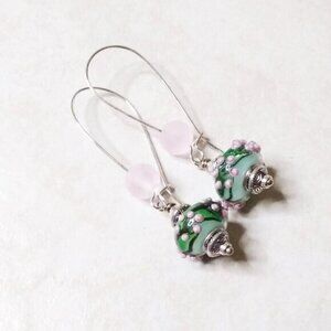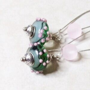 Made with hand crafted, green Murano Glass Beads with a pink floral inspired pattern & pale pink frosted Glass Beads. Oversized stainless steel kidney ear wires.
