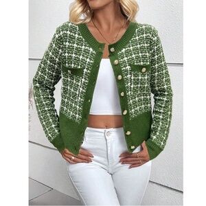 Green Plaid Button Up Cardigan Knit Long Sleeve
