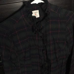 Hunter green & navy plaid long sleeve button up shirt, ruffle detail on front and neck. I love this shirt but it's sadly too small now :(