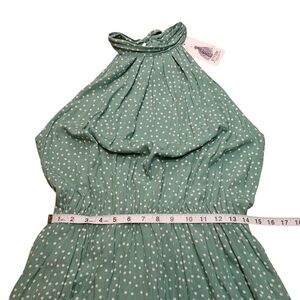Stylish green halter dress with white polka dots. Perfect for any occasion.