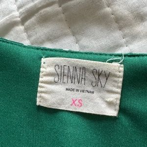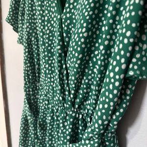 XS green dress with dainty white polka dot pattern. Faux wrap style for flattering shape. Mid/knee length. Silky material. Perfect for wedding guest dress or any occasion.