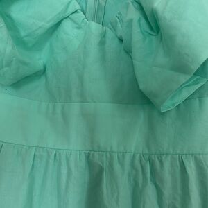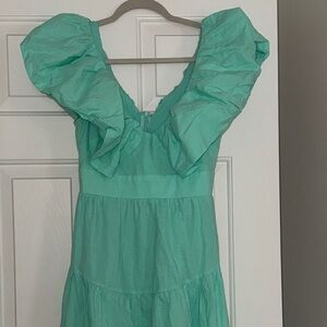 Chic green dress with puff sleeves. Perfect for any occasion. Beautiful for a summer wedding or shower!