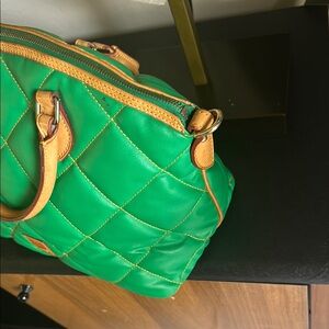 Stylish green quilted handbag with elegant tan accents. Perfect for any occasion.