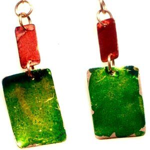 Green Red Geometric Pure Copper Handmade Earrings Abstract Hand Painted Drop