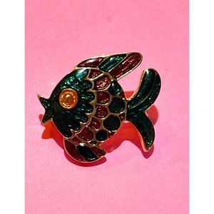 Green Red and Gold Cloisonné Puffy Fish Shaped Brooch Signed Ivana Adorable!