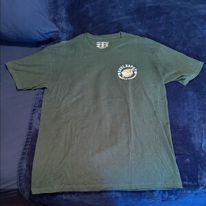 Green t-shirt featuring a vibrant tiger and fish graphic on the back. Perfect for casual wear. Size L