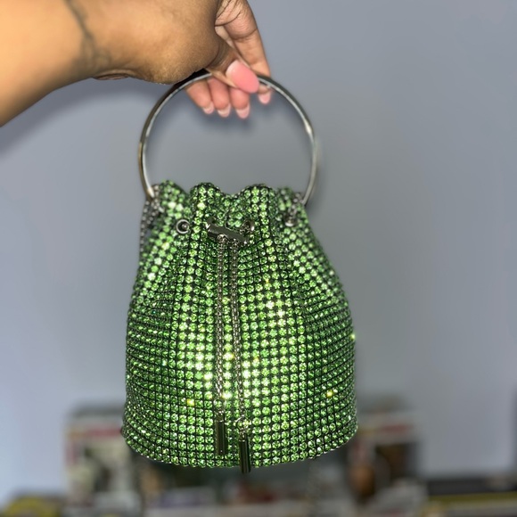 Shimmer with elegance using this stunning green rhinestone bucket bag. Perfect for adding a touch of glamour to any outfit.