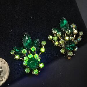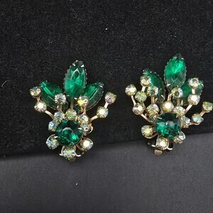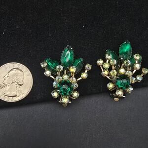 These vintage rhinestone clip on earrings feature green rhinestone floral burst designs and measure 1.4" L x 1.25"