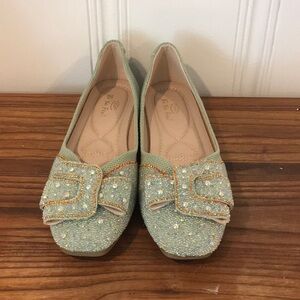 Green Rhinestone Flats, never worn. Willing to negotiate. I am a new principal and trying to find a home for all my shoes that no longer serve my new role!!