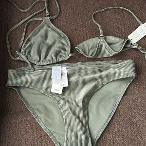 Stylish green ribbed bikini set. Features a halter top and matching bottoms.