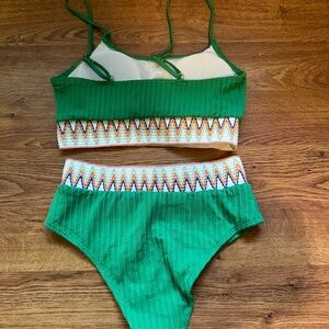 Stylish and comfortable green ribbed bikini set perfect for beach days. Features a flattering high-waisted design.