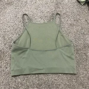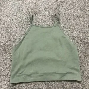 Stylish green ribbed crop top with a high neckline. Perfect for casual wear.
