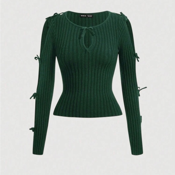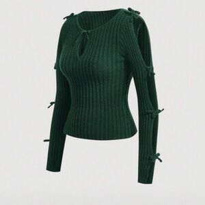 Elegant green ribbed knit top with stylish bow details. Perfect for any occasion.