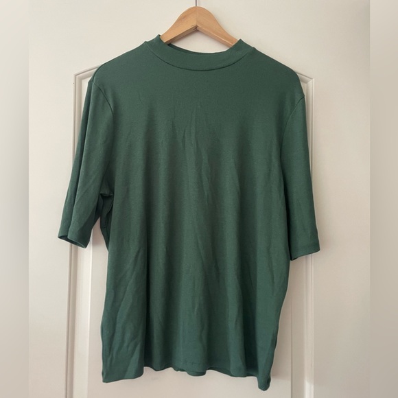 Green ribbed stretchy top. Cute mock neck & elbow length sleeves. Perfect for fall with a shacket, jeans, & boots :)