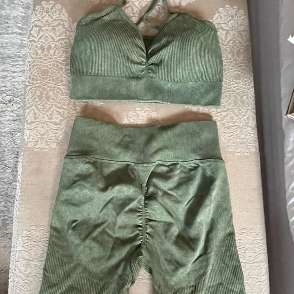 Stylish green ribbed two-piece set. Includes a top and shorts. Perfect for casual wear.
