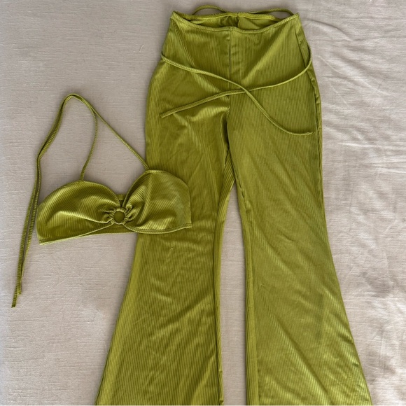 Stylish green ribbed two-piece set. Includes a halter top and flared pants.