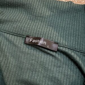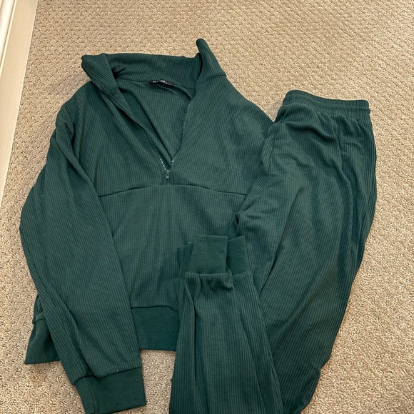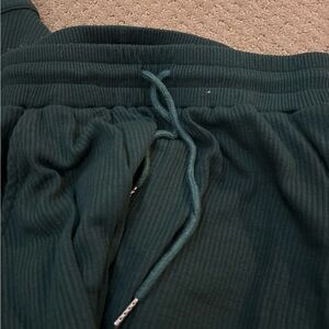 Stylish green ribbed two-piece set. Includes a zip-up top and matching pants. Perfect for casual wear.