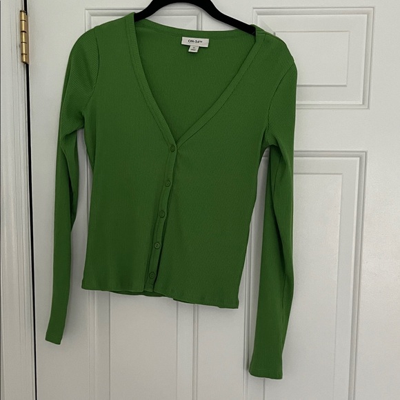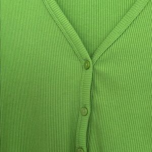 Elevate your wardrobe with this green ribbed V-neck cardigan. Perfect for layering, this stylish top offers both comfort and elegance.