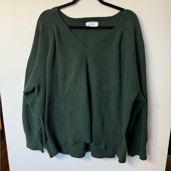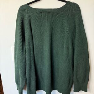 Cozy green V-neck sweater with ribbed texture. Perfect for layering.