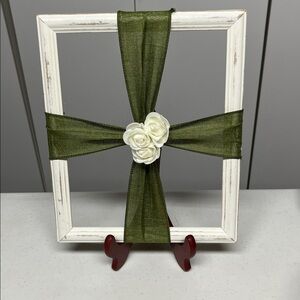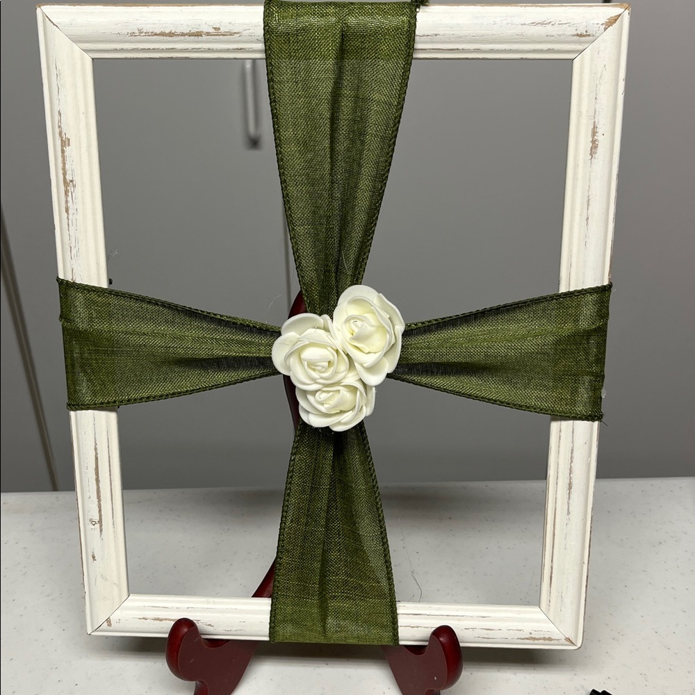 Decorative frame with a green ribbon and white rose accent. Perfect for home decor.