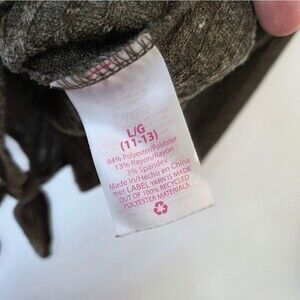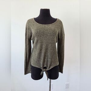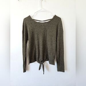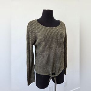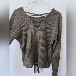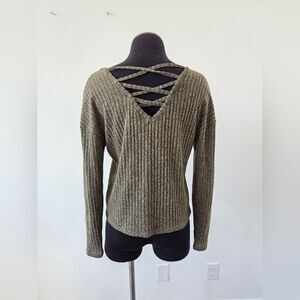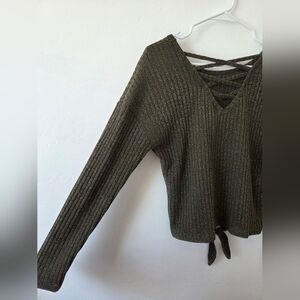 Cute closet staple piece in an olive army green color. Wide ribbed material with a round neckline and knotted front and in the back is a strappy criss cross design. Good condition. Juniors size large. measures approximately 21 inches long 19 inches underarm to underarm laid flat.