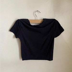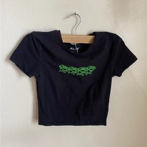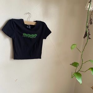 Black crop tee with neon green rose print on front; stretchy material; tight fit; soft, cotton material; no stains or holes; has only been worn once, excellent condition; purchased from Zumiez. All photos are taken in natural daylight near a window without filters added Price firm.