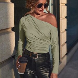 Green Ruched Asymmetric One Shoulder Long Sleeve Shirt Slim Fit Stretchy