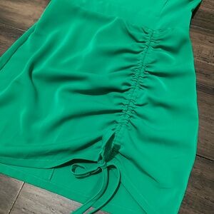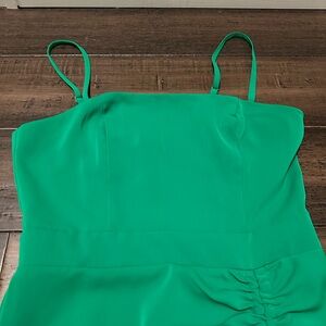 EXCELLENT CONDITION, worn once! This vibrant green mini dress features a stylish ruched design, perfect for any occasion. Has adjustable shoulder straps, rouched design in front, and back zipper.