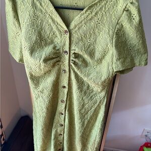 This casual green sundress features a flattering v-neckline and short sleeves, perfect for relaxed outings. The ruched bodice and ruffled hem add a touch of elegance to its midi length, making it a stylish choice for any laid-back occasion.