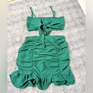 Stylish green two-piece set with ruched detailing. Perfect for a chic look.