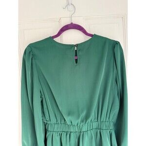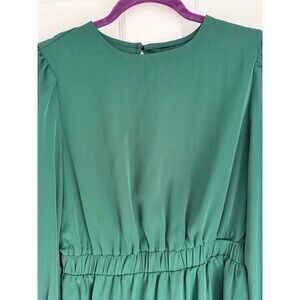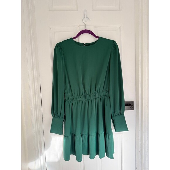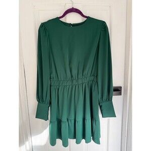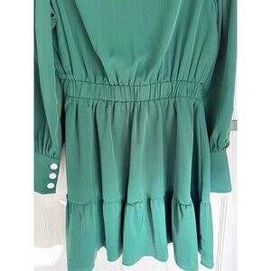 Green Ruffle Mini Dress perfect for winter or the holiday season. White buttons on the sleeves, elastic waist, high neck. Pet and smoke free home