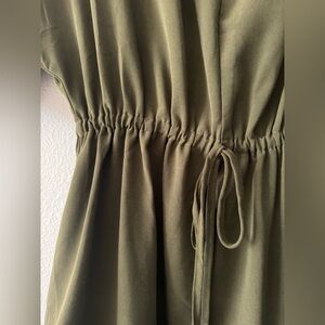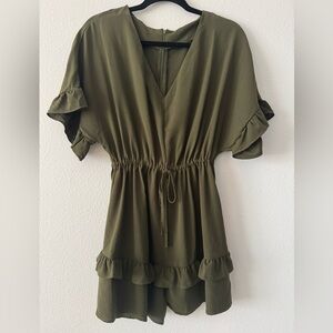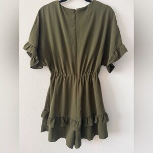 Army green romper with ruffle details. Features a drawstring waist and V-neckline. Chiffon type fabric, very breathable and non see through. Oversized fit.