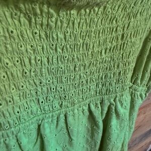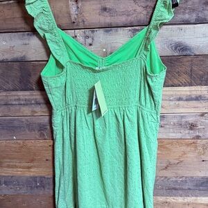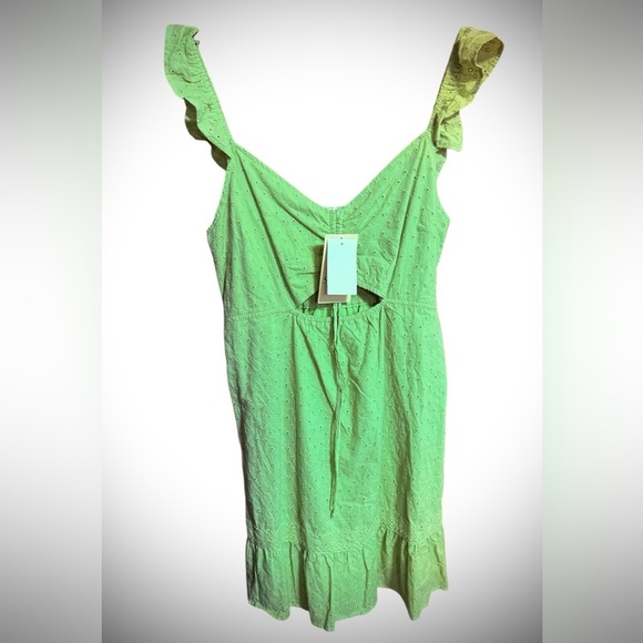 Chic green dress with ruffle straps. Perfect for summer outings.