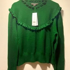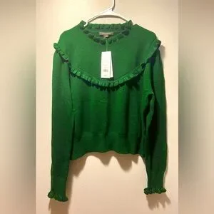 This green sweater is chic and feminine, featuring ruffle details along the neckline, shoulders, and cuffs for a stylish touch.