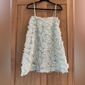 This charming green mini dress features a playful ruffled and tiered design, perfect for a cocktail night out. The sleeveless babydoll style is complemented by delicate spaghetti straps, adding a touch of elegance to its flirty silhouette.