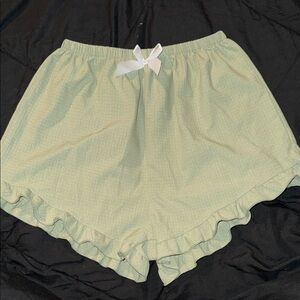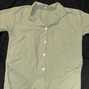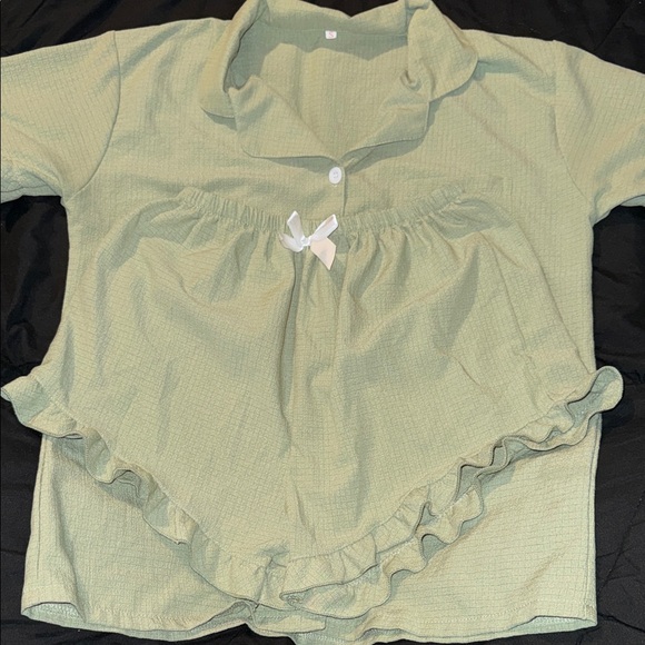 Charming green button-up top with ruffled hem pajama set and a cute bow detail. Perfect for casual nights!
