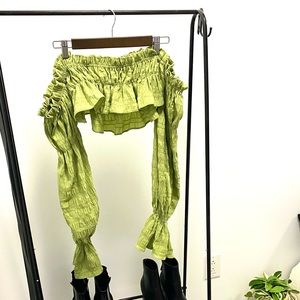 Lime Green ruffled crop top. Definitely a statement piece! I’d pair with a high waisted shirt or pants for a vibrant summer look.