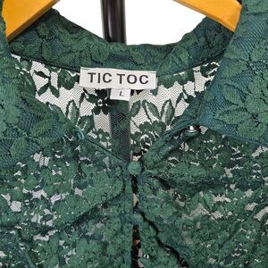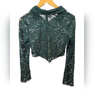 This stylish green blouse showcases a cropped silhouette with delightful ruffled accents and a distinctive bib collar. Crafted from intricate lace, it exudes elegance and charm, making it a standout piece for any occasion.