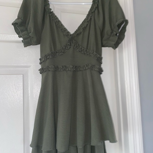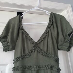 Chic green dress/romper with ruffled details. Perfect for any occasion.
