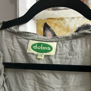 Stylish green open cotton duster with ruffled edges. Perfect for layering. The ties are short and velvet and will frill is machine washed. Hand wash cold!