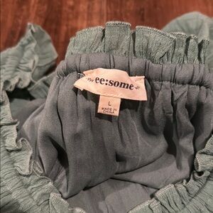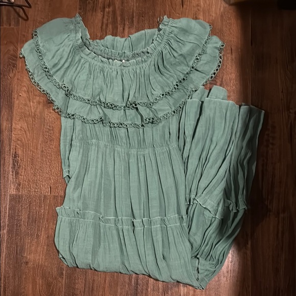 Elegant green maxi dress with ruffled details and off the shoulders. Perfect for any occasion.