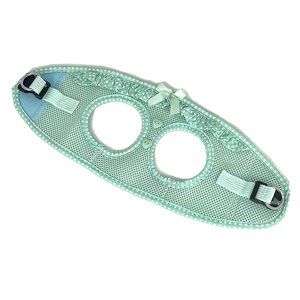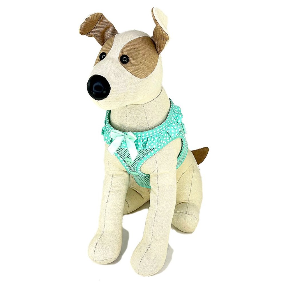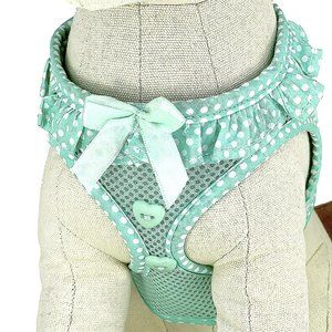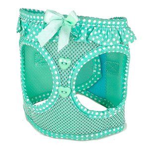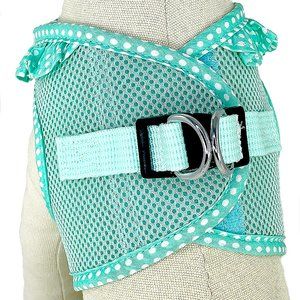 This cute harness is made of a breathable mesh material and has a polka dot ruffle around the neck, highlighted by a satin ribbon on the front. The polka dot pattern edges the rest of the harness. Finishing it off are two heart-shaped buttons below the satin ribbon. The step-in design makes it an easy on, easy off harness and is kept closed by strong velcro tabs and double secured with a quick release buckle. The mint green harness comes in xsmall, size 11"-13", small, size 13"-16" and medium, size 16"-19" around the chest. Made by Doggie Design, it's original price $28.