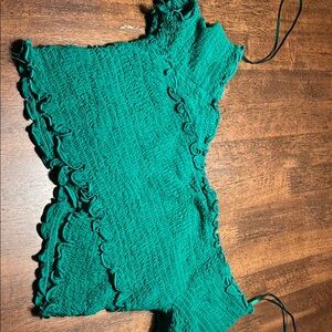 Stylish green off-shoulder top with ruffled details. Perfect for casual outings. Great for St. Patrick’s Day!